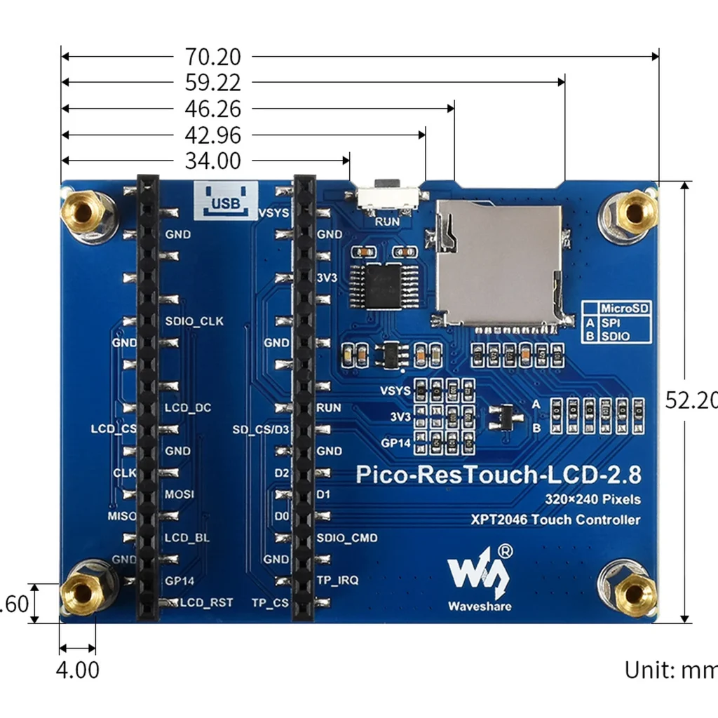 resistive touch controller XPT2046, ST7789 driver, using SPI busComes with Raspberry Pi Pico C/C++ and MicroPython Demo