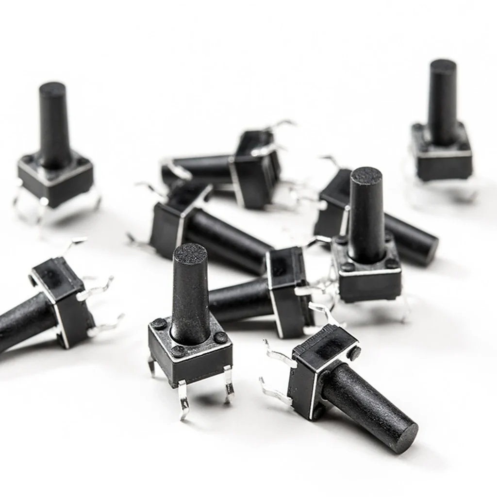 Super-tall clicky momentary switches are standard input “buttons” on electronic projects. These work best in a PCB but can be used on a solderless breadboard as shown in this tutorial. The pins are normally open (disconnected) and when the button is pressed they are momentarily closed. These are extra tall which are useful when putting your project in an enclosure and you want the buttons to stick out.