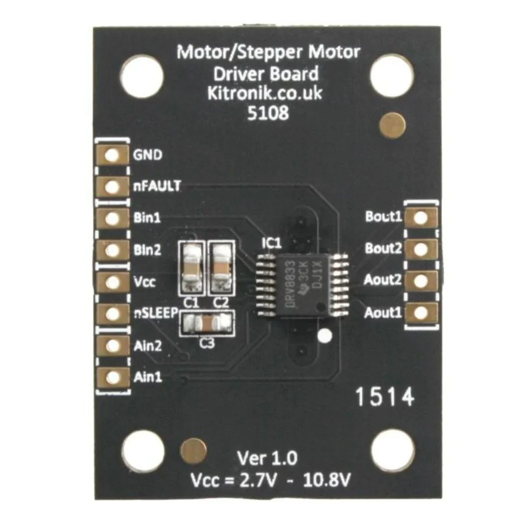 This circuit uses the DRV8833 and allows up to 2 DC motors or 1 stepper motor to be controlled by a microprocessor